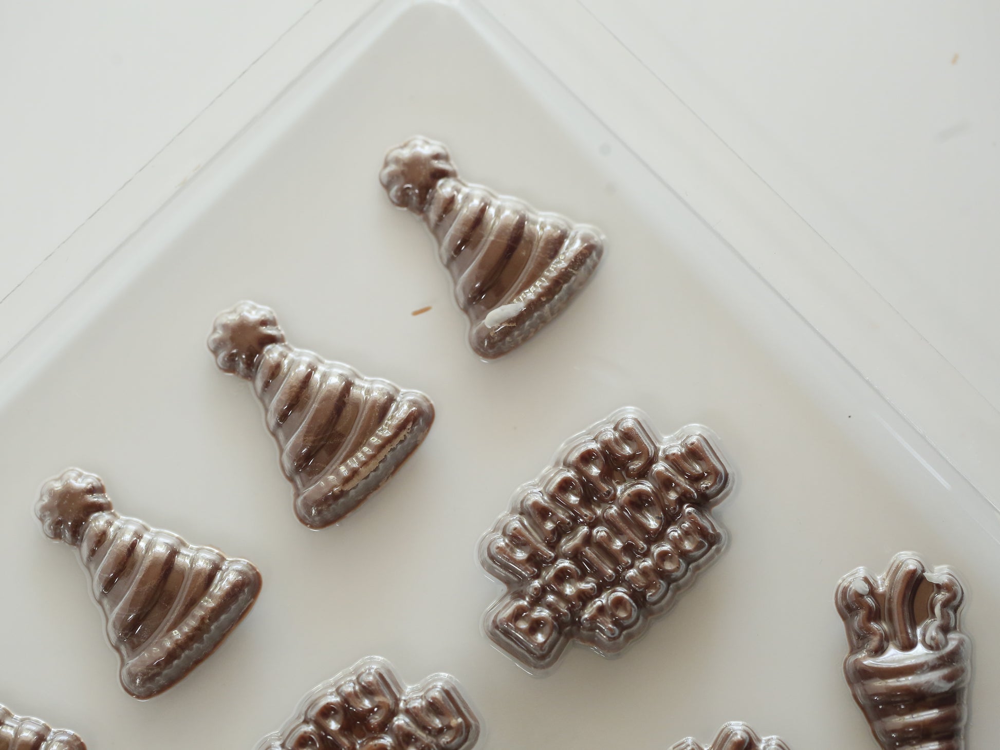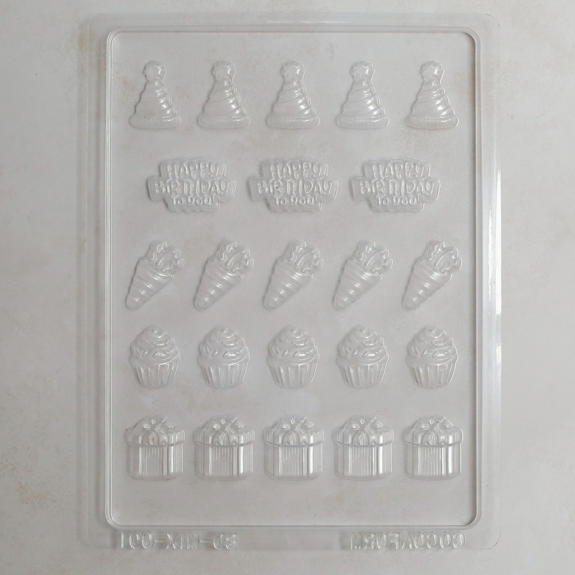 Featuring fun party-themed shapes like 🎉 birthday hats, party poppers, presents, and “Happy Birthday” text, this mould makes it easy to create personalised mini chocolates that impress guests at any birthday party.