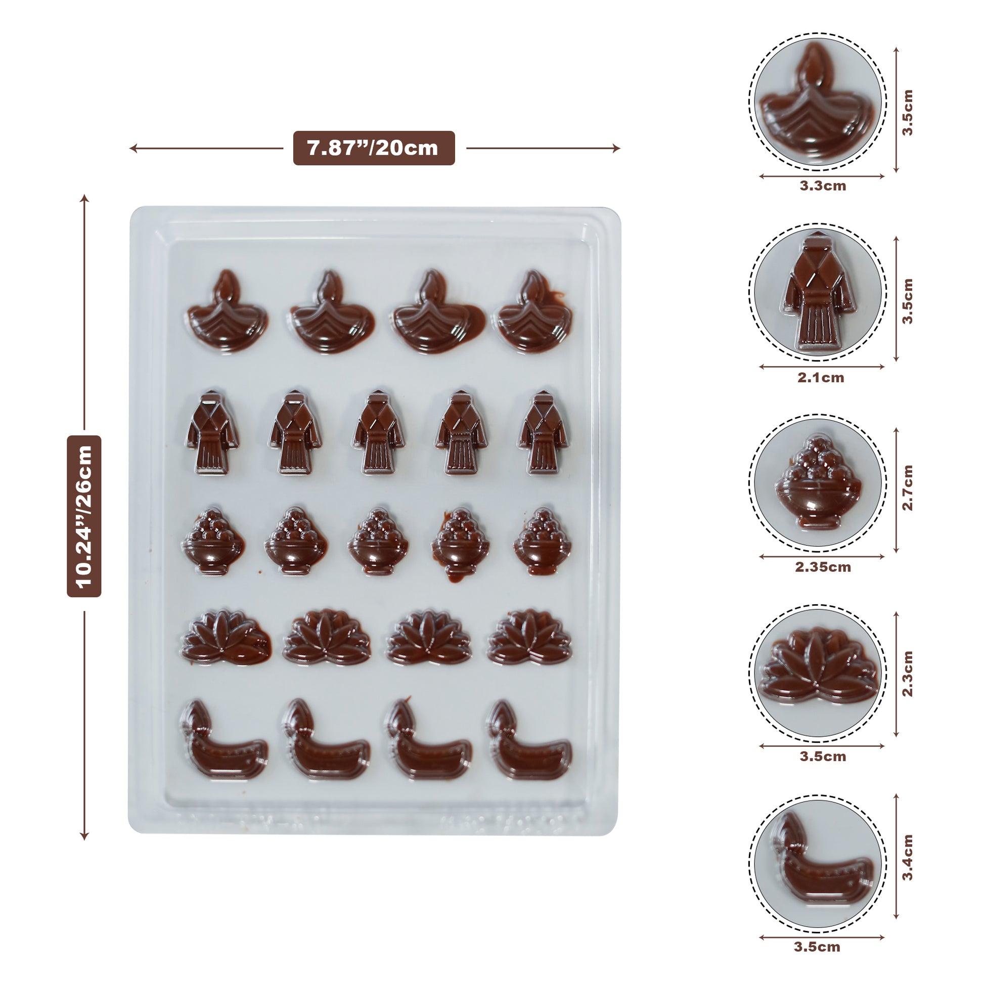 Diwali Chocolate Mould features traditional designs including diyas, lotuses, rangoli-style patterns, and festive arches — perfect for gifts, dessert boxes, or family celebrations.