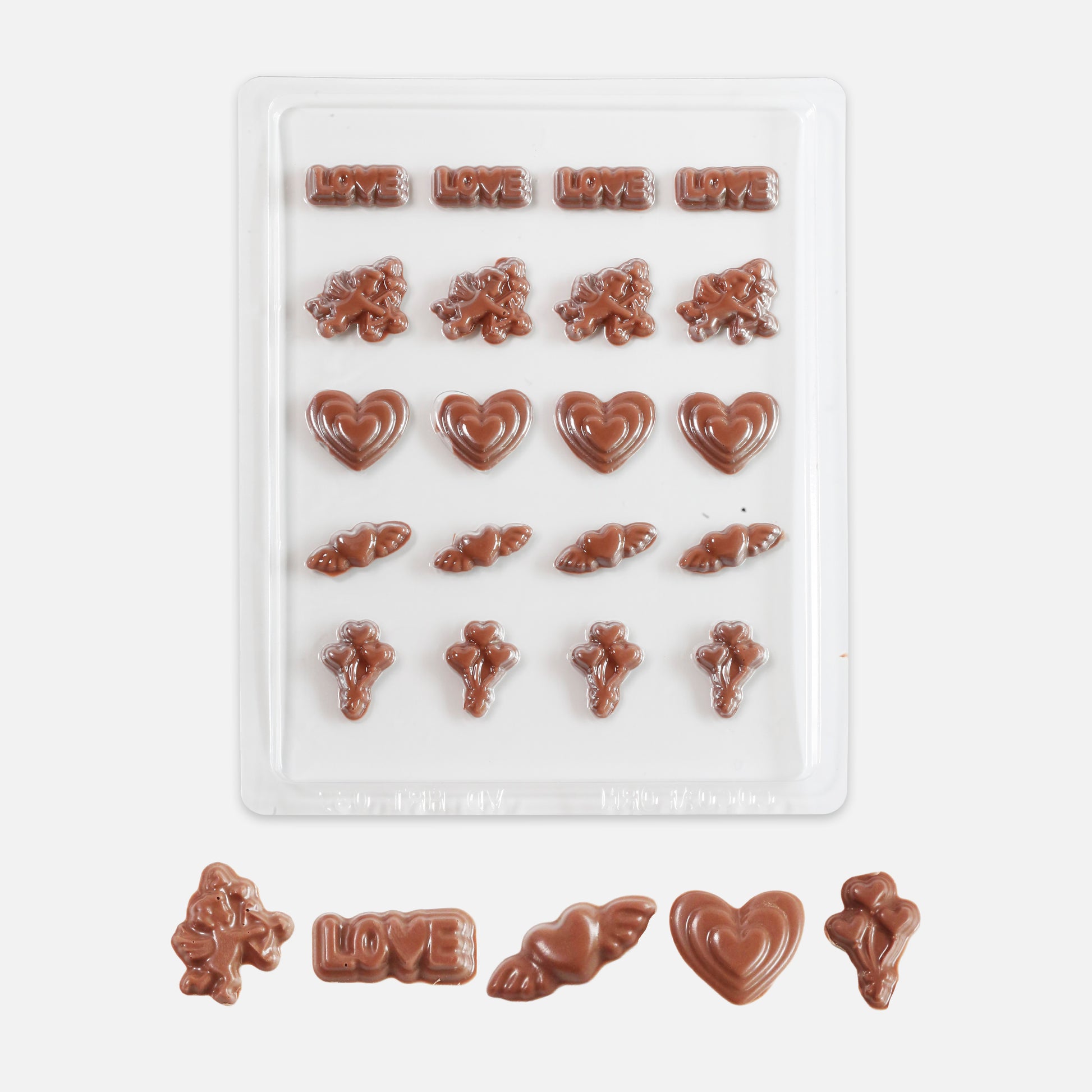 Celebrate love with elegance using our Valentine’s Day Icons Chocolate Mould – Love Edition. This mould features timeless romantic designs like Cupid with his bow, winged hearts, heart balloons, and the word "LOVE"—perfect for creating charming chocolates for Valentine’s Day, anniversaries, weddings, or any romantic occasion.